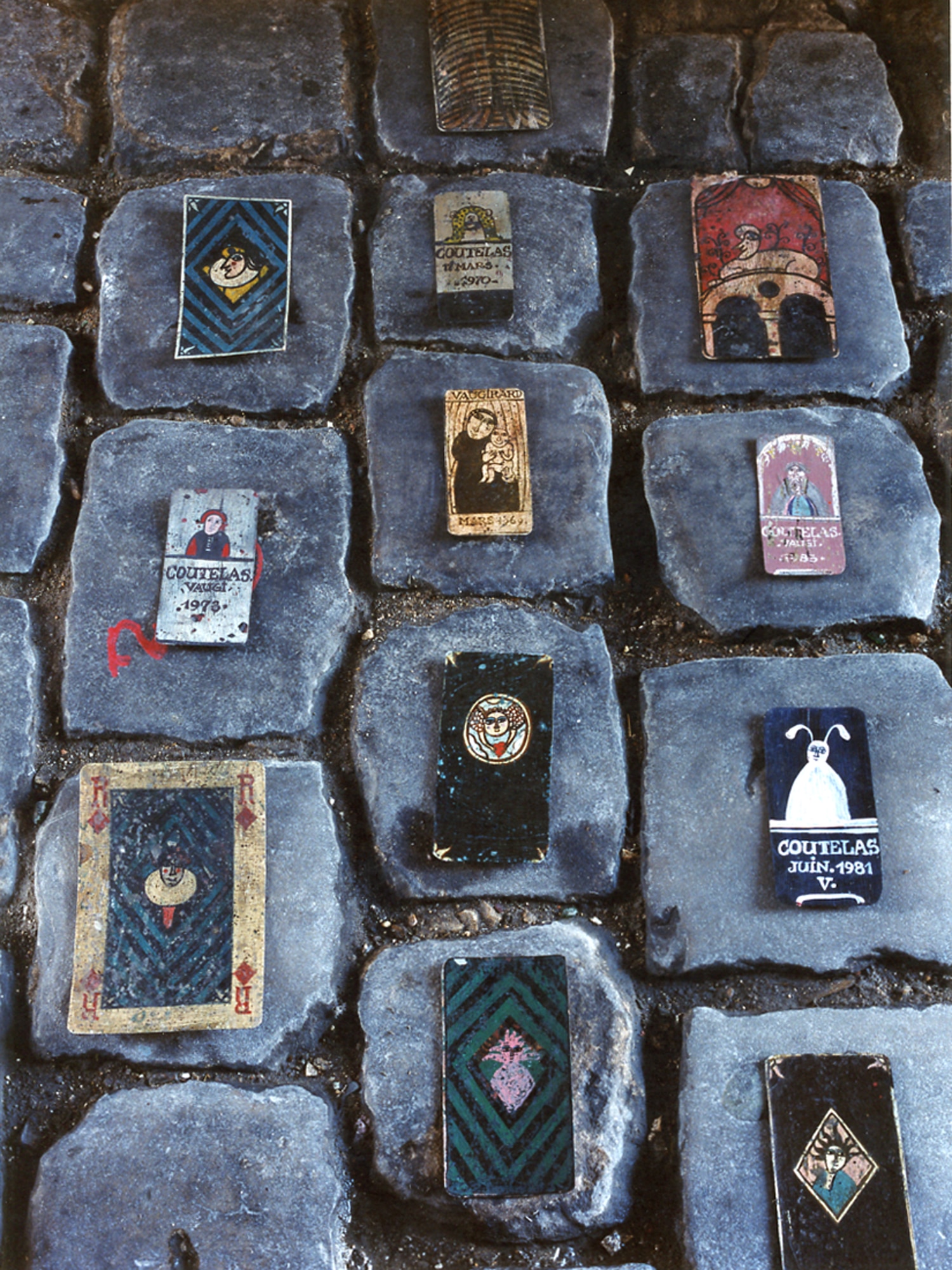 :75年以降カルトを構成する様になり、それを自分で額装して展示し始めています。構成するとなると、それぞれのカルトの色彩やフォルム、シンボルの強弱、寒暖等のバランスに配慮をしますから、組んでいる過程の中で必要になって来るモチーフが出て来ますので、構成上、必要になったカルトを新たに制作することもしばしばでした。ですから、クートラスが構成したカルトは構成自体も彼の作品です。でも、元々、カルトは一枚一枚が作品なのです。
